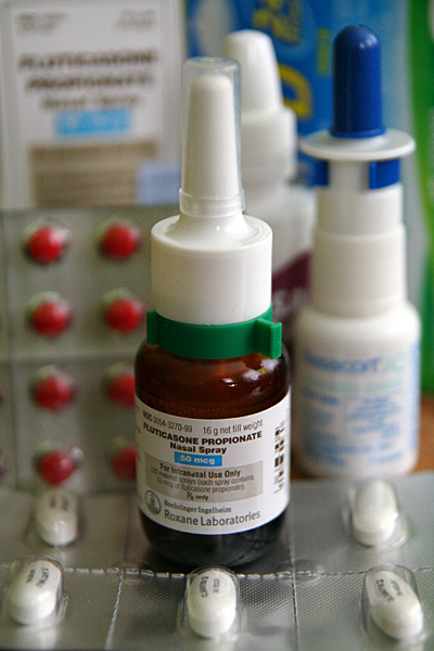 i wasn't disappointment that we never figured out what was the cause. however, i did want to talk to him about the muffled hearing i've been experiencing in my left ear since as far back as october. he checked my ear and it seemed normal: no inflammation, no perforated eardrum. a look down my throat revealed nothing as well. lacking anymore clues he decided to throw a bunch of drugs at me to see if it'd clear up my sinuses, which seemed to be the root of the problem. besides taking some claritin-D (pseudoephedrine sulfate & loratadine), he also told me to take some sudafed as well (pseudoephedrine hydrochloride), a combination of antihistamine and decongestant. that's followed my some afrin nasal spray (oxymetazoline hydrochloride) plus the prescription strength nasal spray flonase (fluticasone propionate).