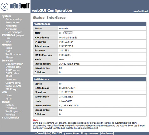 i'm still confused about the WAN LAN though. i could only see the web interface if the WAN cable was attached to the LAN output. it sort of doesn't make sense, kind of like having two dueling routers, each one with it's own DHCP server. i'm not even sure how my computers managed to see the internet amidst all this networking confusion. hopefully i can get my hands on a wireless router next week and set it up as a wireless access point (WAP). i could use the wifi router i have now, but i'm afraid to play around with the settings because everything works fine now and i don't want to screw up my own network while testing out the m0n0wall machine.