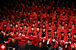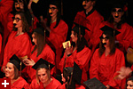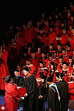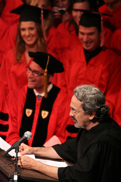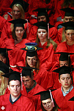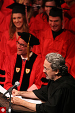 instead of the traditional black graduation gowns, the graduates of the college of fine arts were decked out in red. staring at them long enough, the color would eventually burn into my retina and i'd see ghost graduates when i blinked my eyes. the commencement speaker was craig lucas, whom i didn't know, but i kept asking myself if he was related to george lucas. he gave a very colorful funny speech, peppered with the occasional s-bomb (maybe i'm too prudish) and very political, slamming the republicans and george bush whenever possible. i guess not too many conservatives dabbling in the fine arts? alisa sat just along the edge of the stage where we couldn't see her until she got up for the handing off ceremony. i was relieved there was no performances (strange though, being that it is the fine arts school, with a lot of graduating actors and musicians) and the entire ceremony was over in about 2 hours.