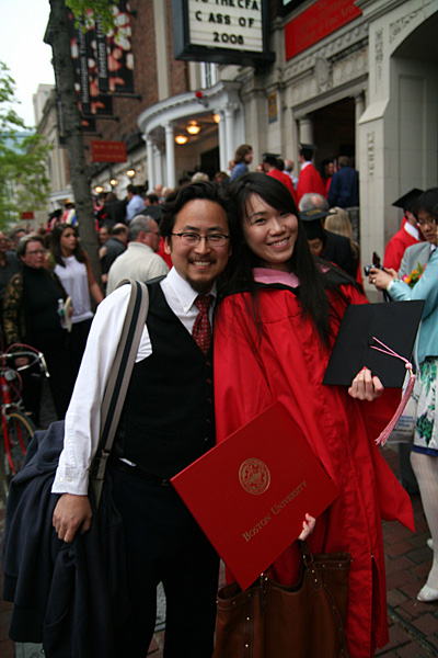 ask me to honestly say what i want to be doing this sunday afternoon and i'll answer truthfully that i would rather spend it at home watching game 7 of the celtics cavaliers matchup. but i promised alisa i'd attend her master degree graduation from boston university's school of fine arts (in music education) after she instant messaged me a week ago in a depressed mood because none of her family members would be coming (a little expensive considering they're all back home in taiwan).