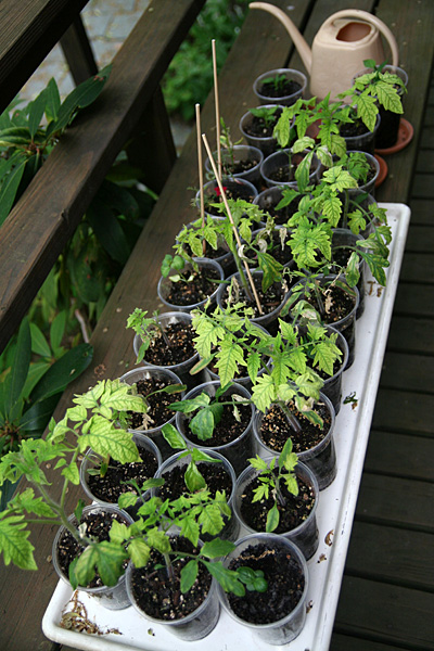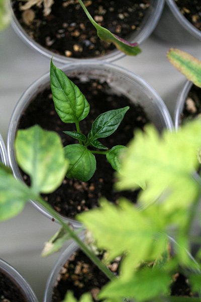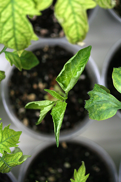 i passed by the community garden on my way back. i noticed some people have already planted their tomatoes. that reminded me to bring out my indoor plants for hardening so they can finally be transplanted within the next few days. they haven't been doing very well. despite the fact that i'm using 4 rows of fluorescent lights, i think the colors are wrong, resulting in very chlorophyll deficient plants. i think they'll do better once they're exposed to real sunlight (and i can finally shut down my closet grow house).