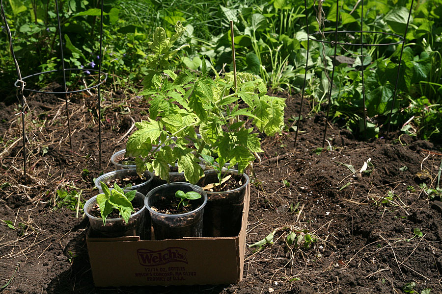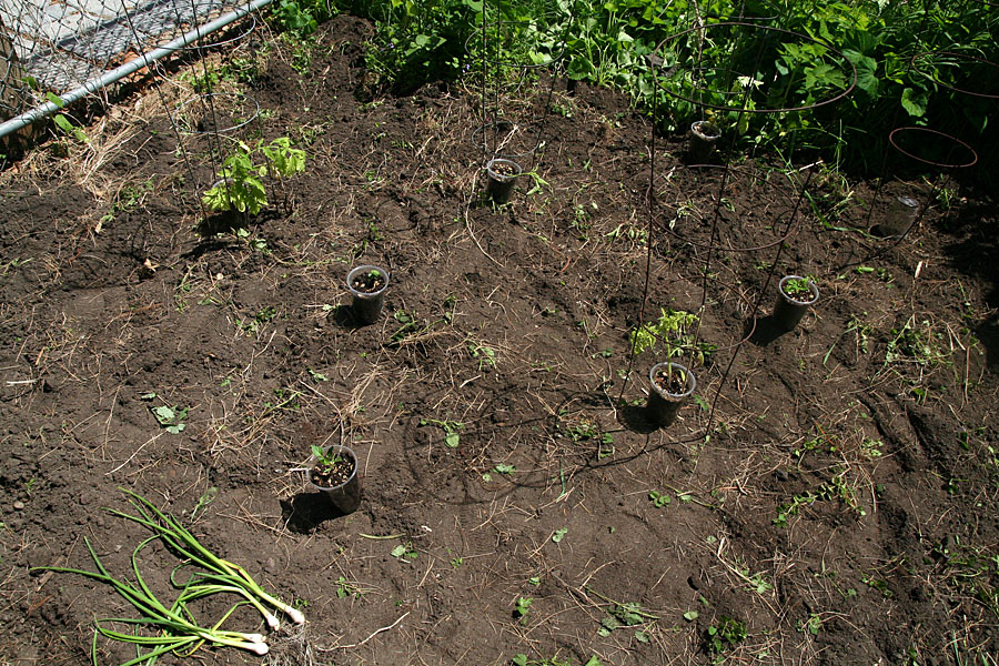 once that was done, the soil was ready for planting. i decided to do an expanding radial pattern this year, starting from the corner of my garden where the perennial chinese lantern plant i grew last year survived through the winter and was now thriving (it was a sickly little plant last year). my indoor-grown transplant seedlings aren't in the best of shape. there was a period where i neglected them, and i think the soil mixture i used had poor drainage because pretty much every transplants suffered from some form of root rot. most affected were the tomatillo, and i may have to start another batch indoors as replacements. faring the best were the tomatoes, and other than the lack of proper chlorophyll in the leaves, they seemed fine. but i'm hoping that a heavy dose of sun and fresh air would bring all these sick seedlings back to health again. i also replanted some scallion bulbs that had survived the winter as well. after i watered the garden, i returned home for a well-deserved shower.