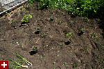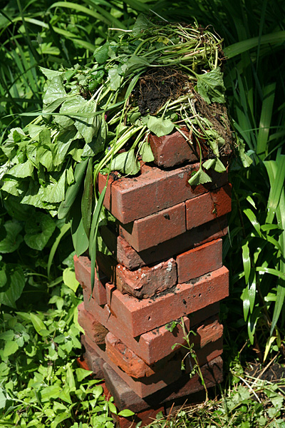 the next stage involved sifting through the garden with the hoe, pulling out any stray plant matter. most of it was ground ivy, which seemed to have taken over the place since my last visit. although my plot isn't particularly enormous, i did work up a tremendous sweat while toiling in the garden with this memorial day heat, my t-shirt soaked in perspiration, my shoes filled with soil, and my face covered in dirt.