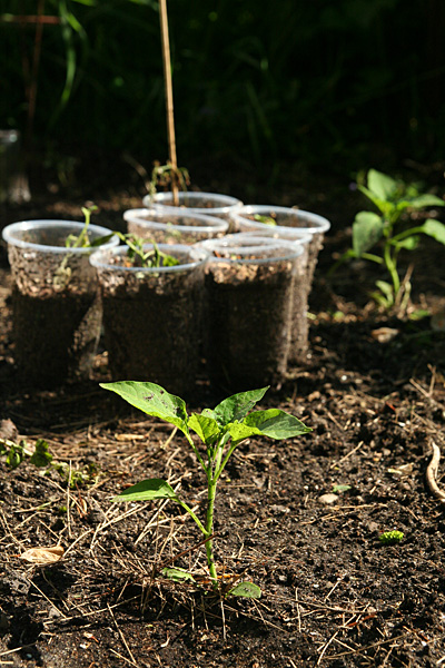 later i visited my garden. i pruned the nasturtiums down to the stems; i'll plant the ones that regrow their leaves. i still have some nasturtium seeds (both from the packet and from the indoor plants) so i can start some new ones whenever i want. the few tomatillos i planted weren't doing very well so i covered them up with the plastic cups. apparently that has a therapeutic effect because they're doing much better now. once they're strong enough i'll take the covers off. i also found my single basil plant. i thought i lost it but it was just hiding underneath one of the plastic cups.