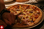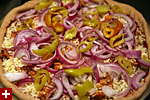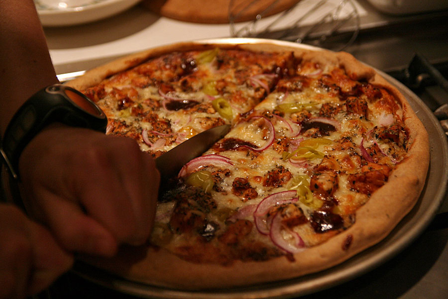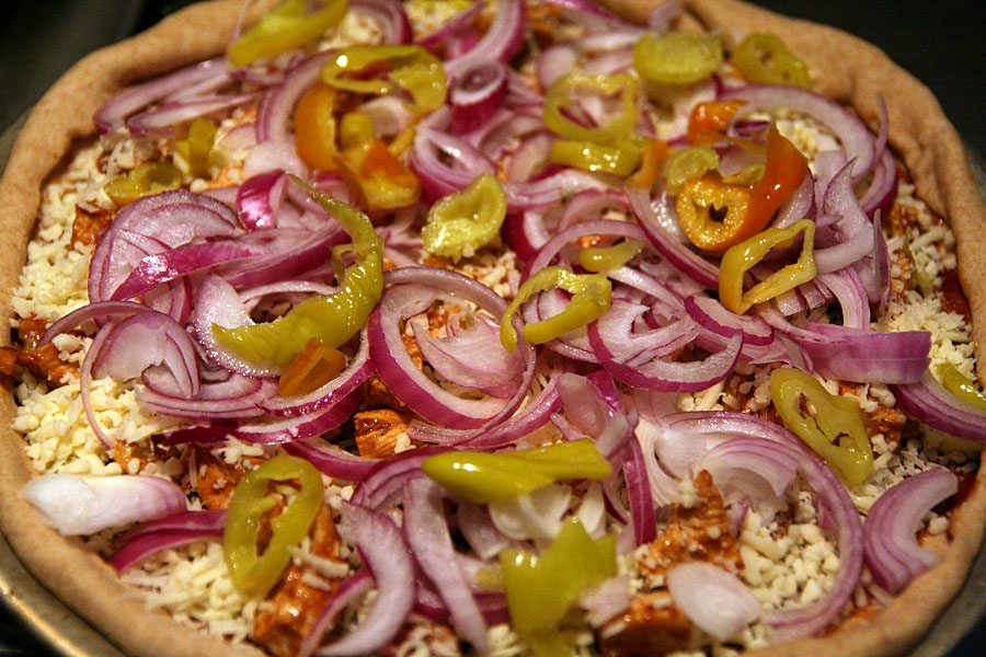 by the time julie arrived in the evening, i already had my homemade (via bread machine) pizza dough, onion slices, and was in the process of grilling the chicken breasts on the foreman grille.