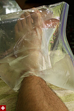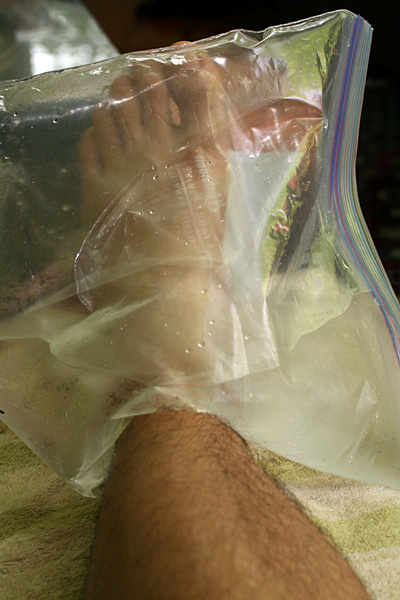 this morning there was less swelling but i still couldn't walk and had to hop around on one leg, and even that one good leg had issues of its own. after some ice pack treatment and ankle flexing exercises though, i was able to put some weight on my left leg, enough so i could at least move around the house gingerly, in a quasimodo-like shuffle.