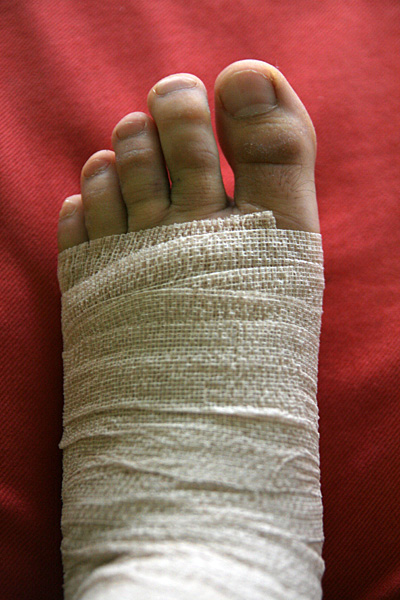 something i noticed about my foot: ever since the accident, i haven't done much walking, just basically confined to my house. however today i really put my foot to the test, and as a result, there was some serious new bruising on the outer and inner part of my foot, as the blood started to pool in those areas. it's kind of gross but after i bandaged everything up i couldn't see it anymore.