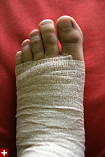 by then i had already been in the hospital for almost two hours (i got there at 10am) before they called me to see the doctor. i stripped down to my underwear (ugly carrot-patterned boxer shorts, not even sure where i got them). the doctor pressed around, made me walk and flex my foot. "unfortunately, your x-rays aren't ready yet," she told me, "and radiology has already gone to lunch." she said more than likely it was just soft tissue injuries (which would heal on their own), but if she saw anything to be concerned about in the x-rays she'd call me back. in the meantime, i was supposed to rest my foot, bandage it up, and keep it elevated.