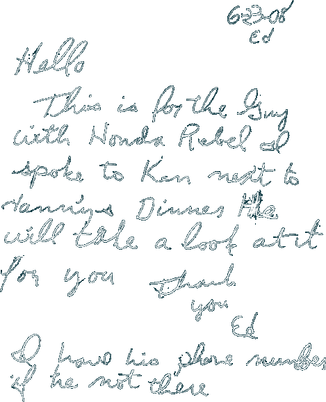 it was almost 4pm when i made it back to my place and found that note slipped underneath my front door. i was kind of hurt that my new best friend doesn't remember my name (i'm bad with names myself), referring to me as "the guy with the honda rebel." i thought it was interesting that he wrote his own name twice, and that the message is actually dated a week into the future.
