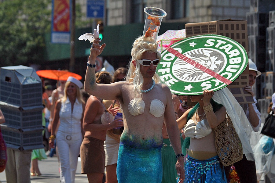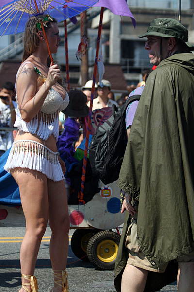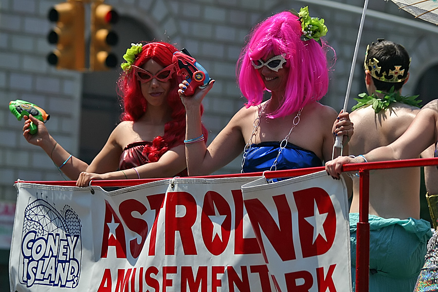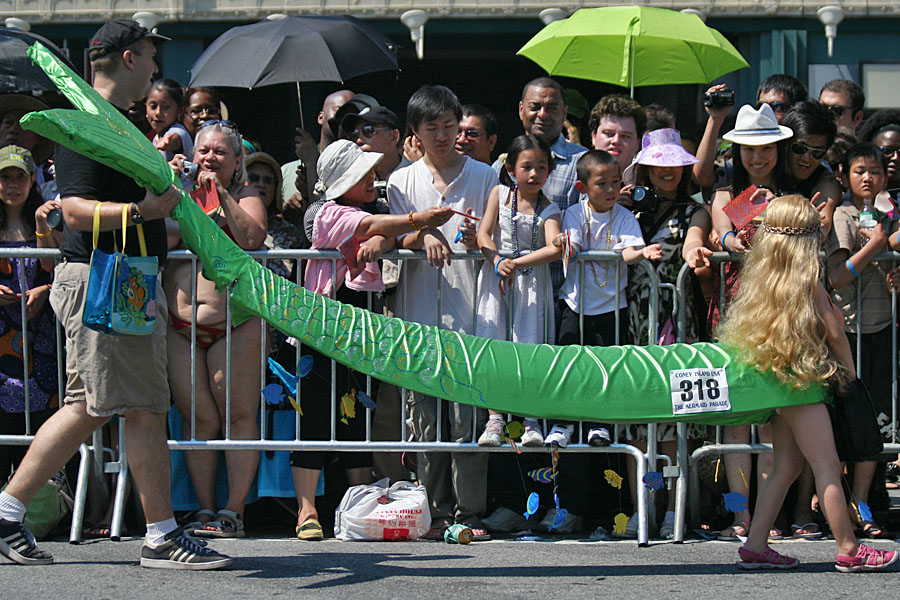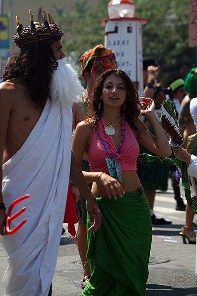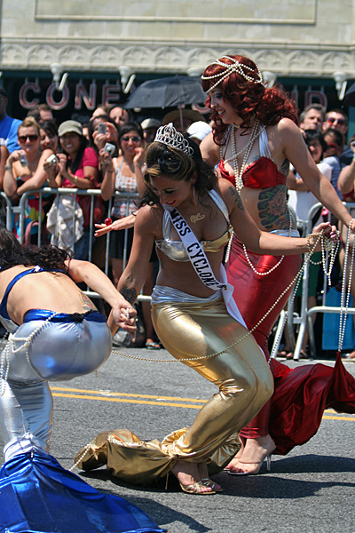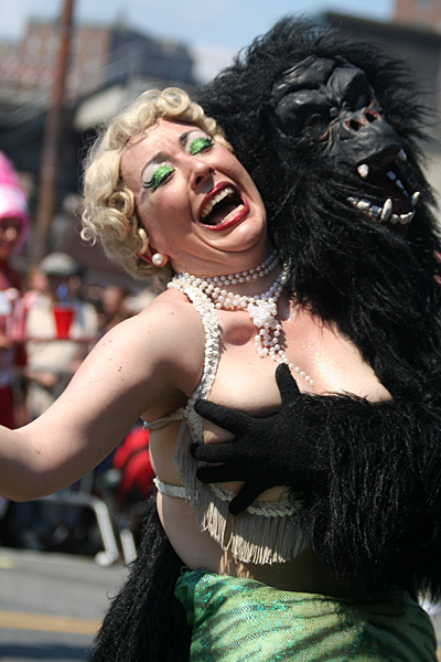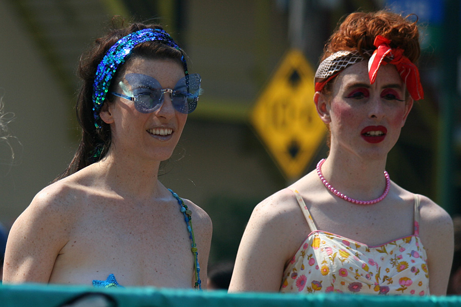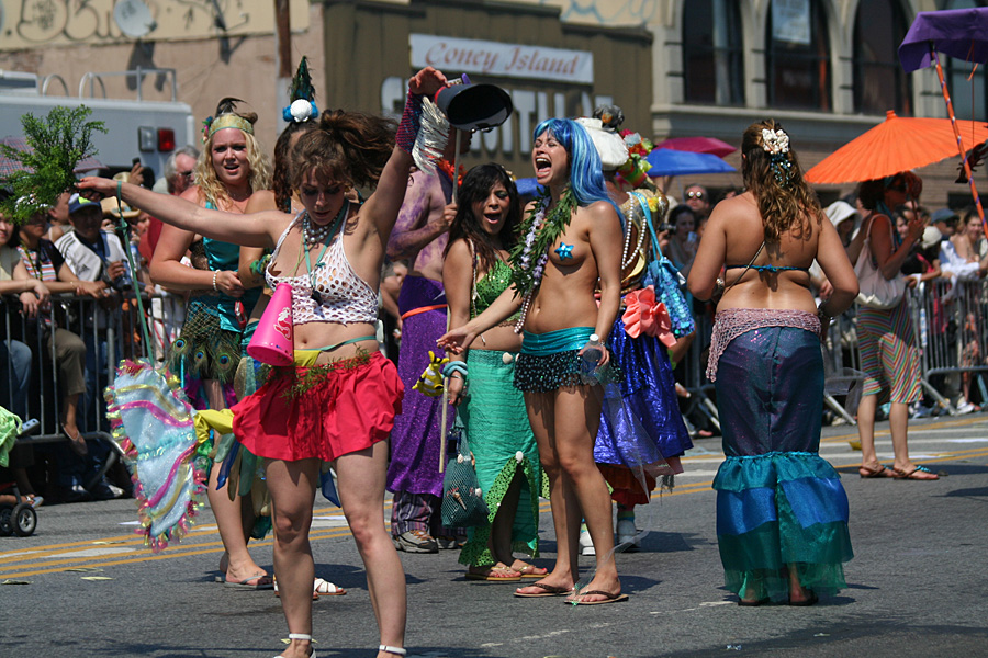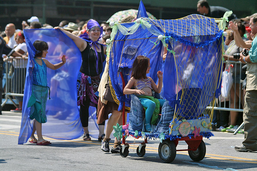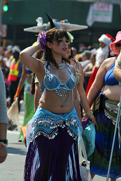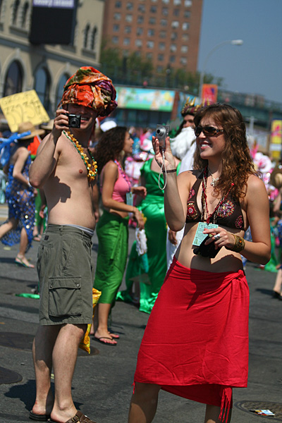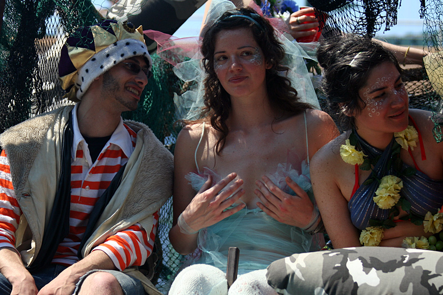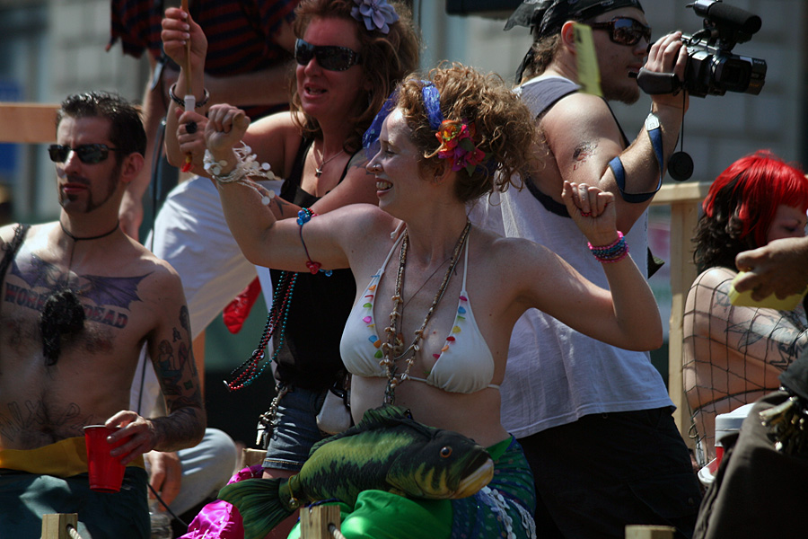 this being my third mermaid parade (2007 2006), i still have a hard time explaining what exactly it is. is it a celebration of coney island? an art festival? an anti-establishment protest march? it's a little bit of everything. certainly you have the whole eponymous mermaid theme, the extension of that anything to do with water, whether it be sea creatures, mythical water gods, fictional underwater characters, or island life. there's the local burlesque shops which provide a whole bevy of eye-catching talent. antique cars, bikers, flappers, goths, punks, hipsters, wizards, performance artists, carnies, marching bands, dancers - that's just a sampling of the representation.