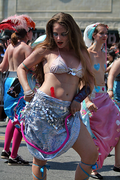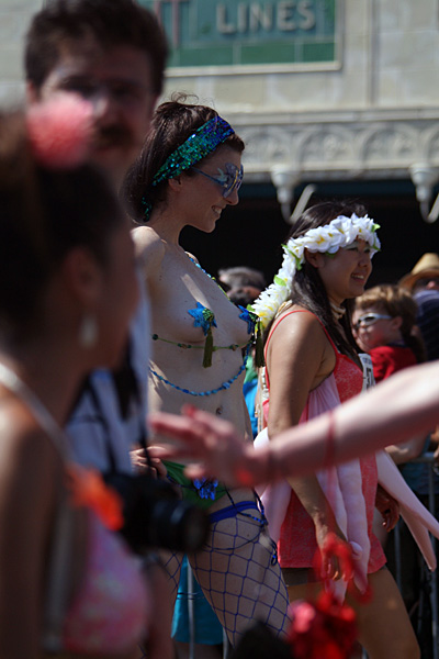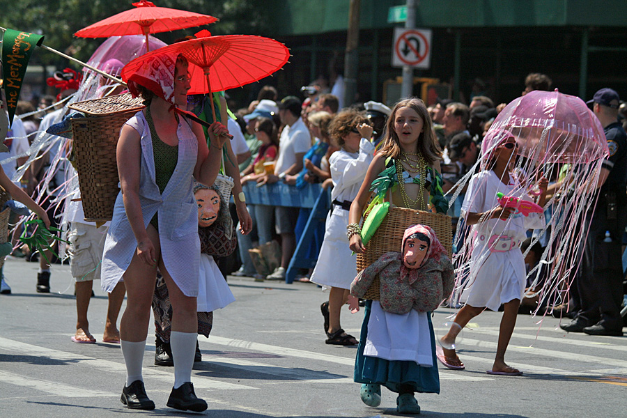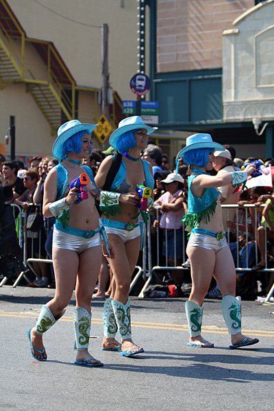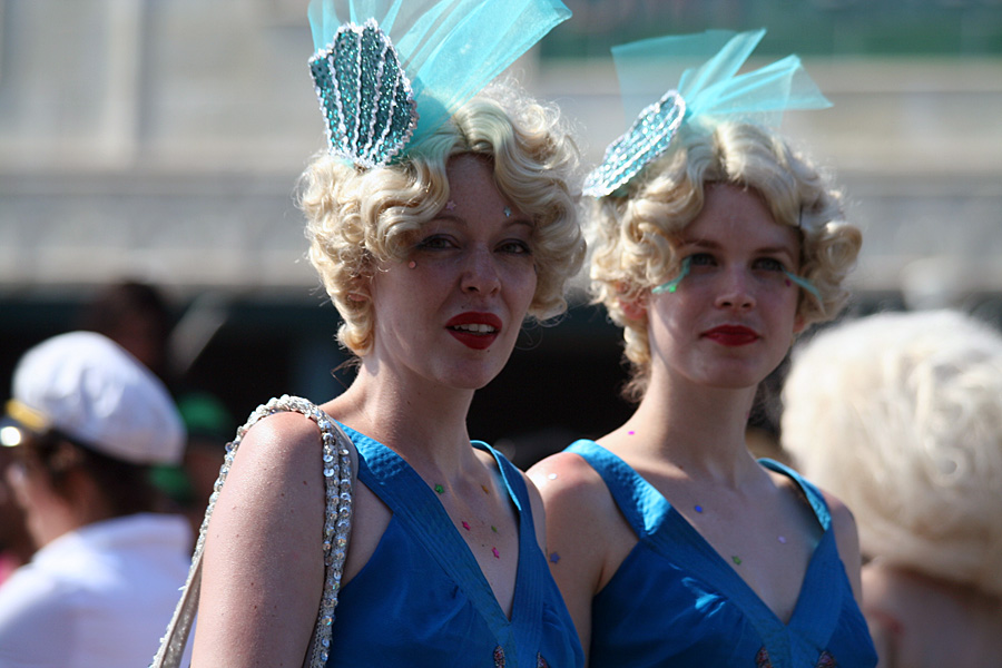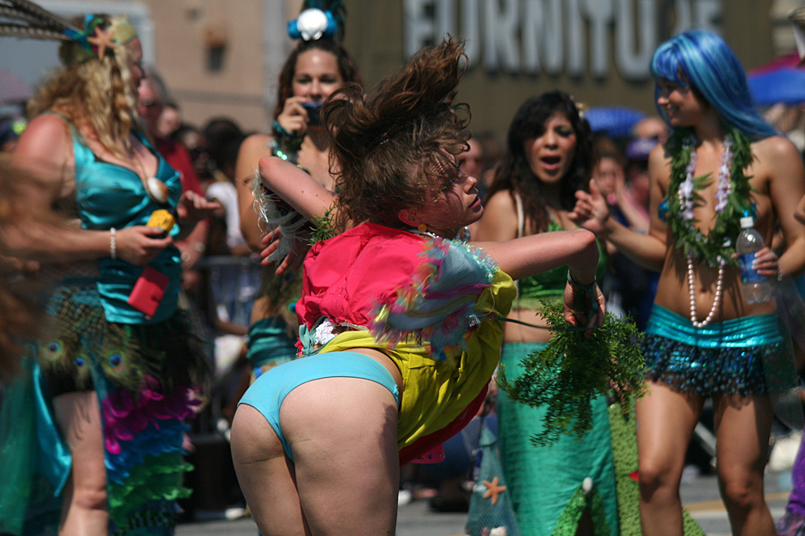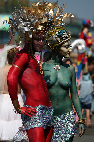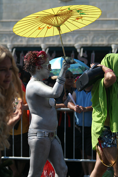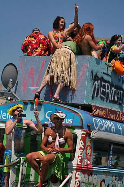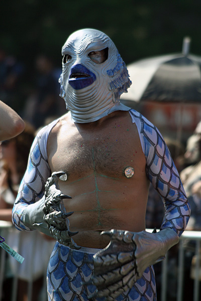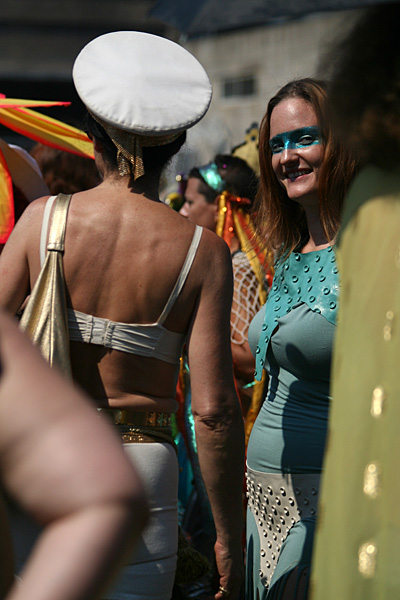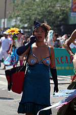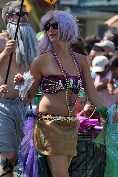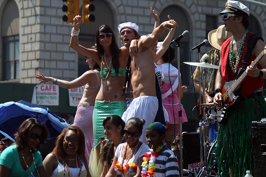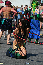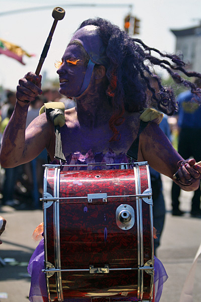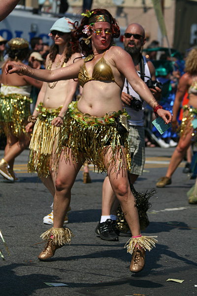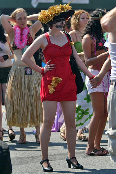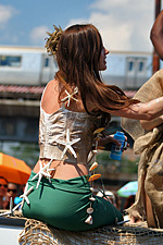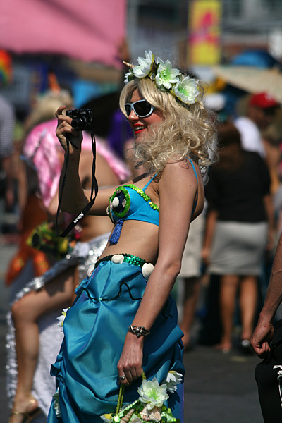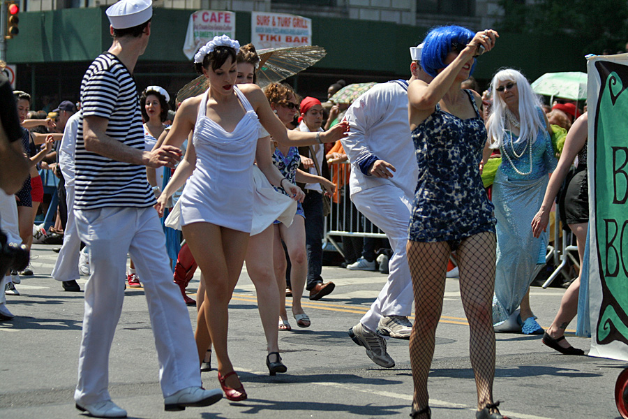 this being my third mermaid parade (2007 2006), i still have a hard time explaining what exactly it is. is it a celebration of coney island? an art festival? an anti-establishment protest march? it's a little bit of everything. certainly you have the whole eponymous mermaid theme, the extension of that anything to do with water, whether it be sea creatures, mythical water gods, fictional underwater characters, or island life. there's the local burlesque shops which provide a whole bevy of eye-catching talent. antique cars, bikers, flappers, goths, punks, hipsters, wizards, performance artists, carnies, marching bands, dancers - that's just a sampling of the representation.