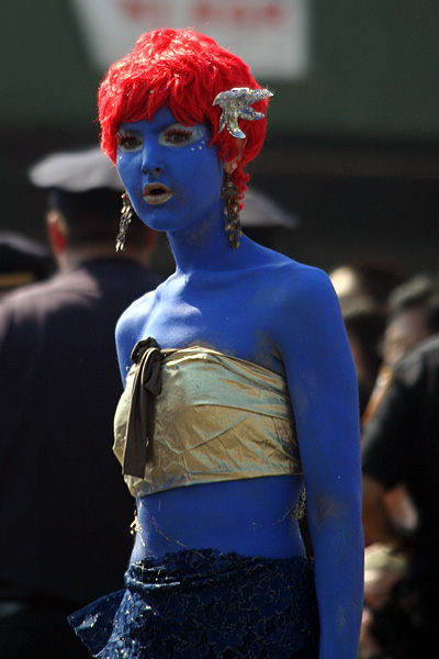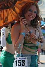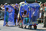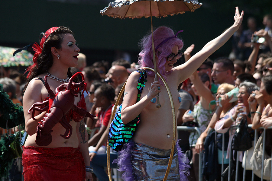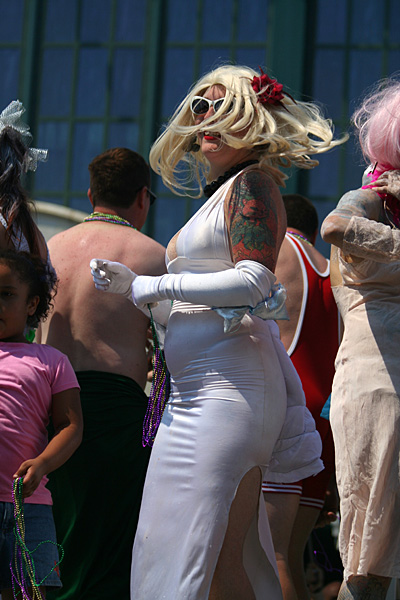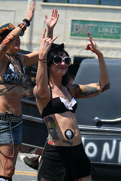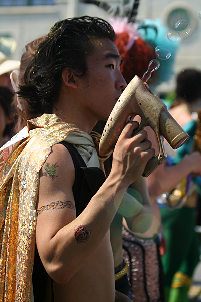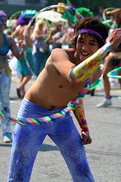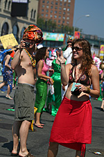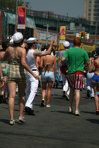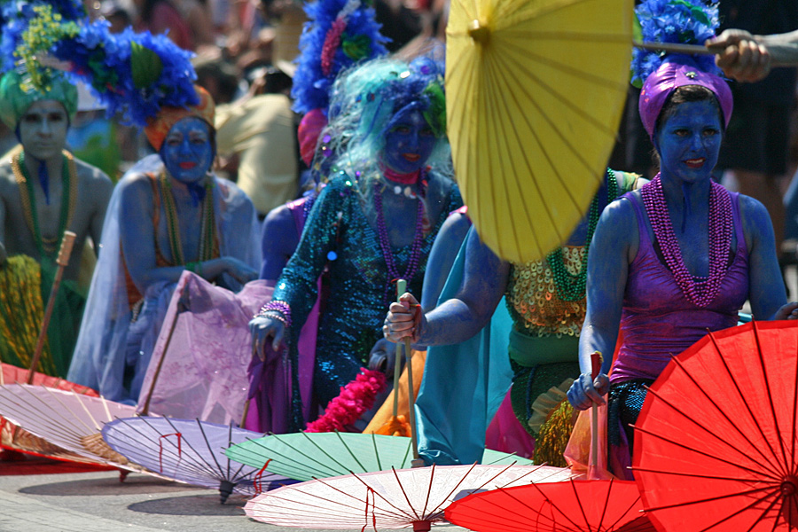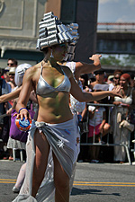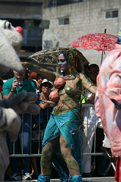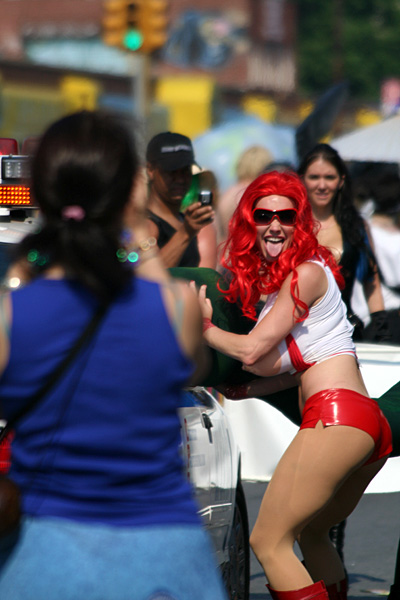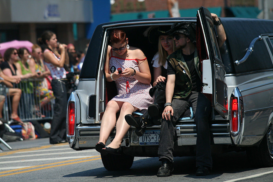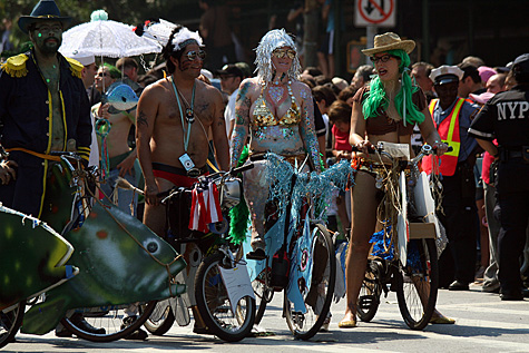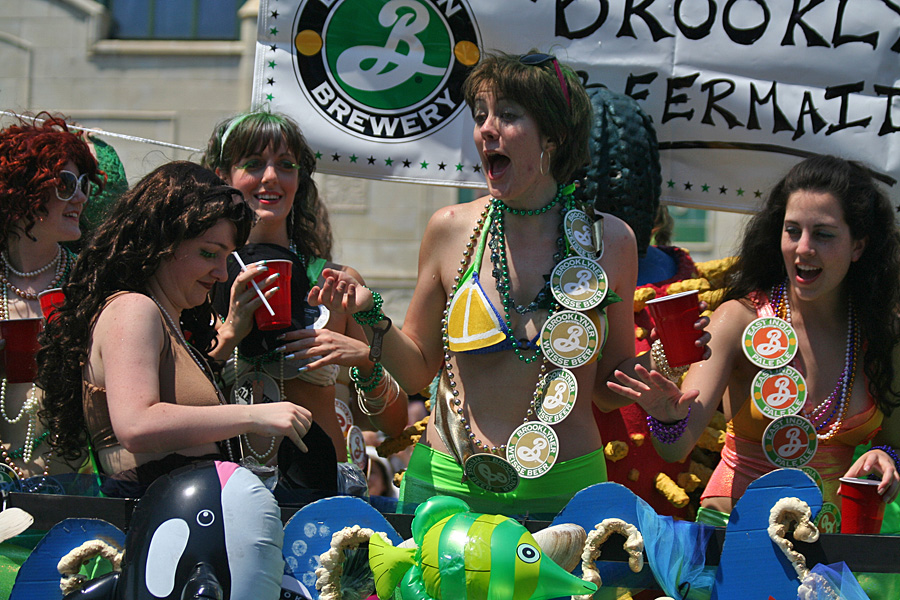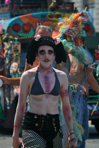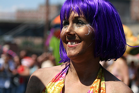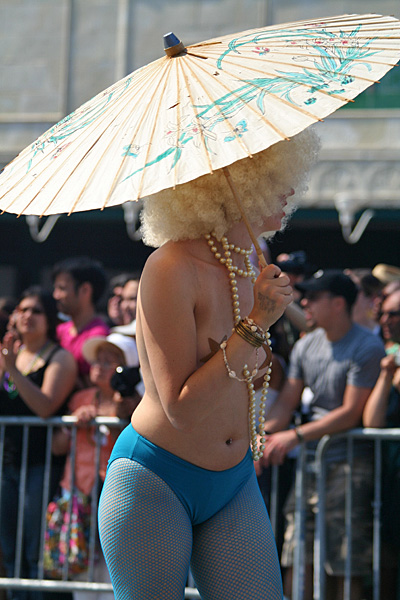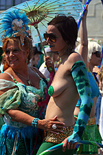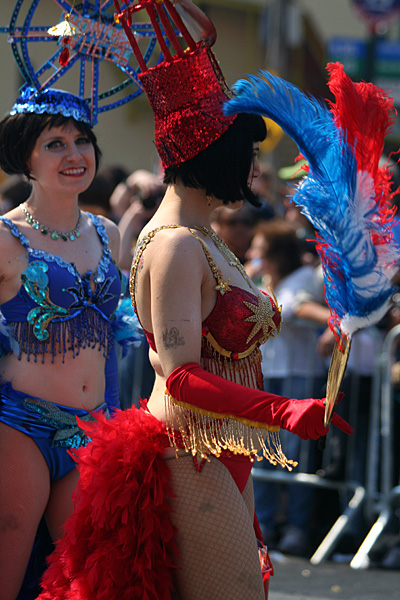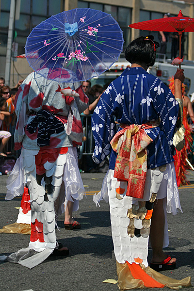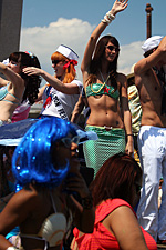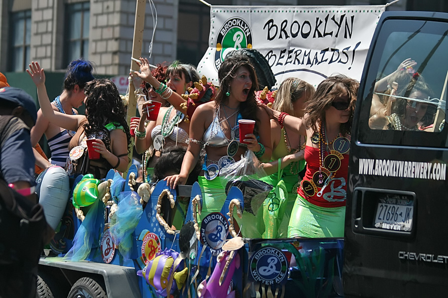 this being my third mermaid parade (2007 2006), i still have a hard time explaining what exactly it is. is it a celebration of coney island? an art festival? an anti-establishment protest march? it's a little bit of everything. certainly you have the whole eponymous mermaid theme, the extension of that anything to do with water, whether it be sea creatures, mythical water gods, fictional underwater characters, or island life. there's the local burlesque shops which provide a whole bevy of eye-catching talent. antique cars, bikers, flappers, goths, punks, hipsters, wizards, performance artists, carnies, marching bands, dancers - that's just a sampling of the representation.