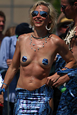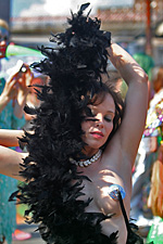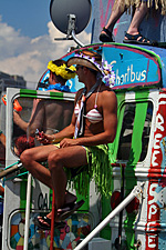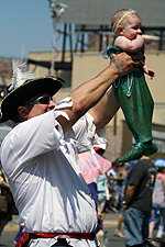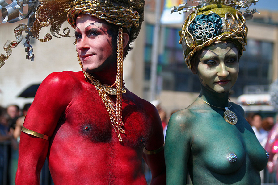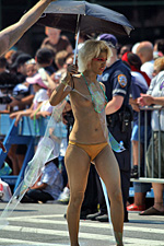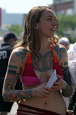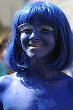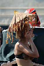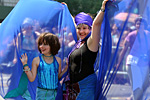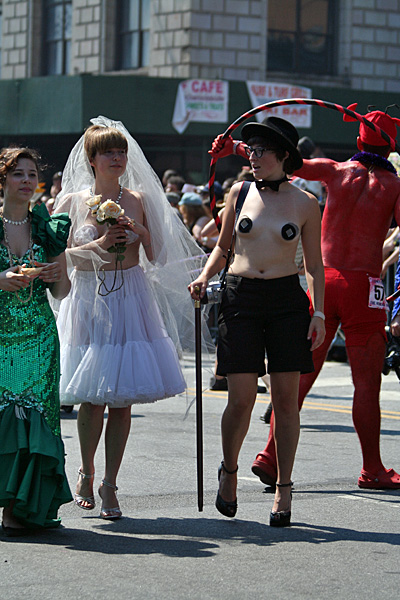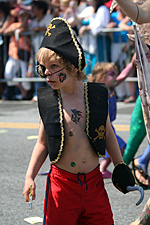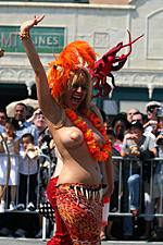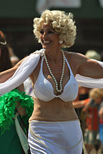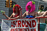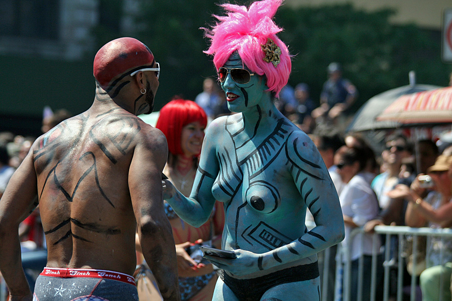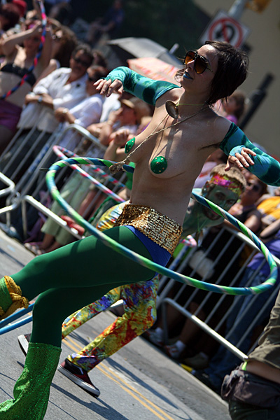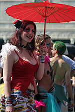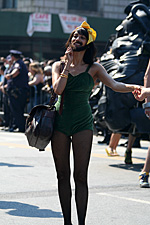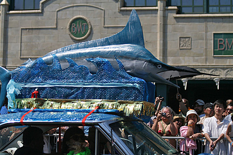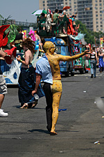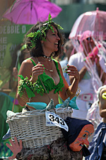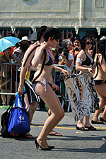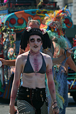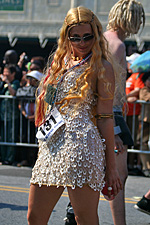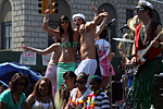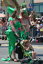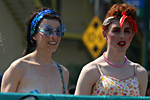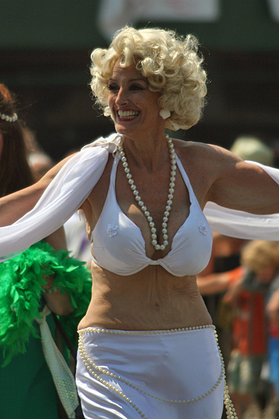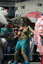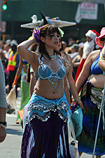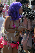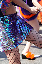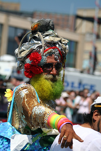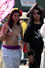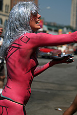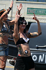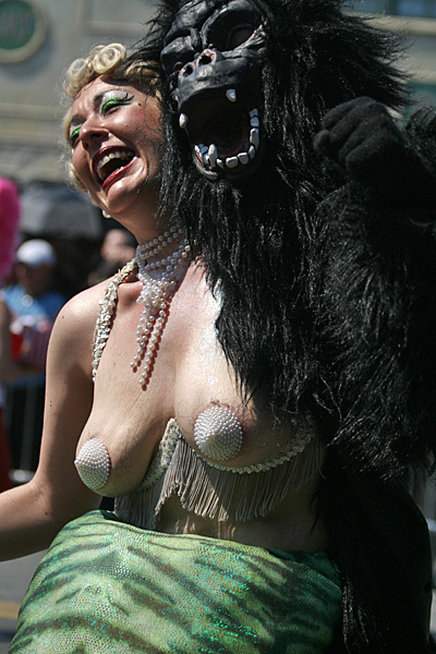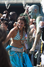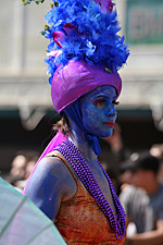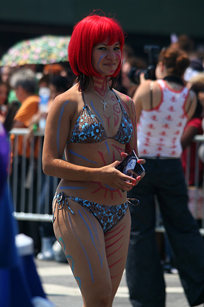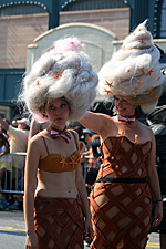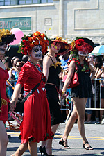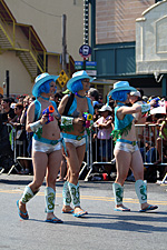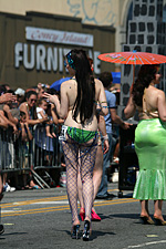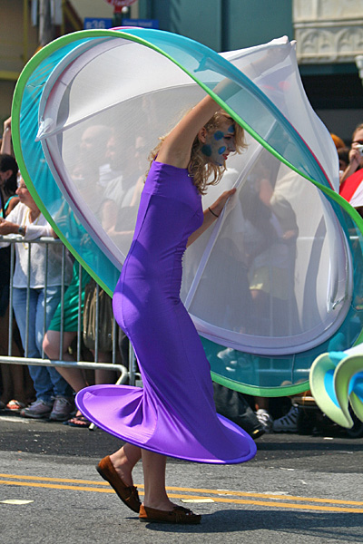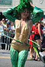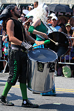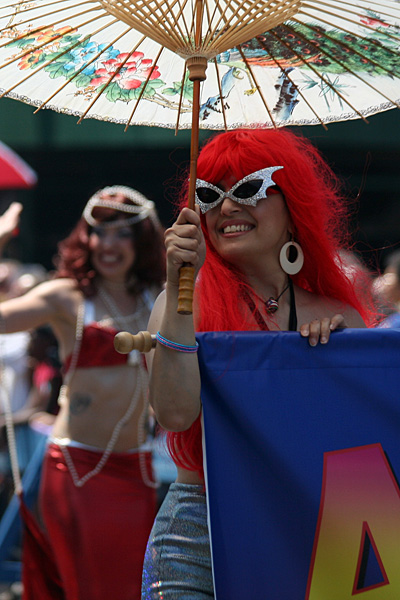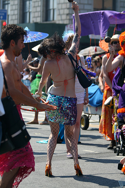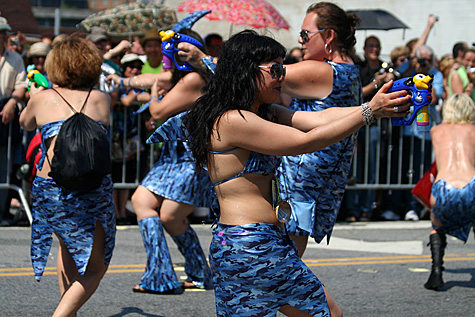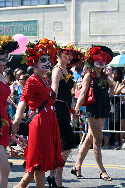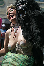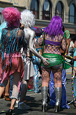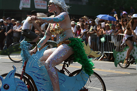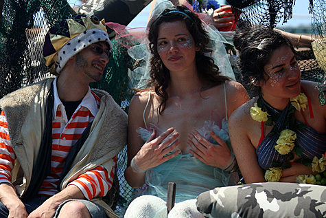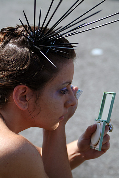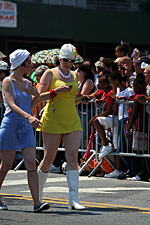 this being my third mermaid parade (2007 2006), i still have a hard time explaining what exactly it is. is it a celebration of coney island? an art festival? an anti-establishment protest march? it's a little bit of everything. certainly you have the whole eponymous mermaid theme, the extension of that anything to do with water, whether it be sea creatures, mythical water gods, fictional underwater characters, or island life. there's the local burlesque shops which provide a whole bevy of eye-catching talent. antique cars, bikers, flappers, goths, punks, hipsters, wizards, performance artists, carnies, marching bands, dancers - that's just a sampling of the representation.