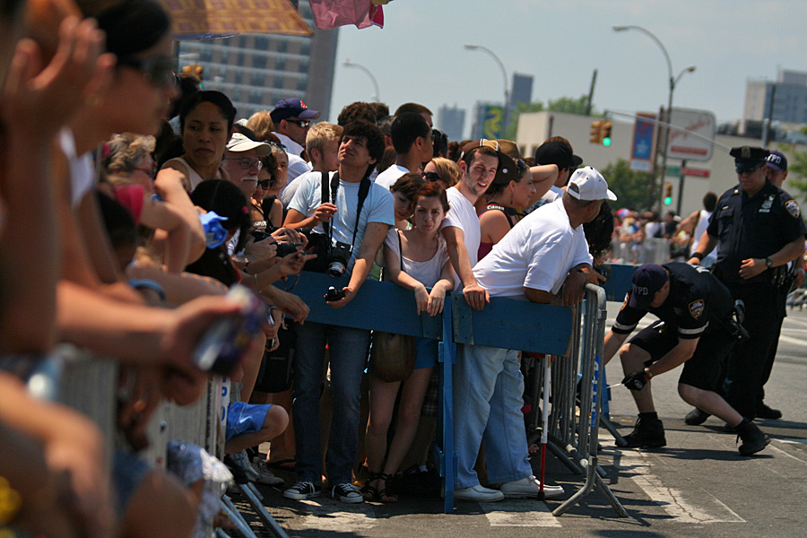 people were already picking their spots and lining up behind the metal barricades. i was next to this asian guy eating out of a takeout box. when i heard him talking to his friends on his cell phone, i recognized his taiwanese accent immediately. i struck up a conversation with louis, found out he's a student from taiwan living in NYC for the past year. i got myself a cold soda and prepared to hunker down for the next 4 hours.