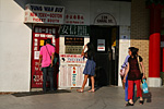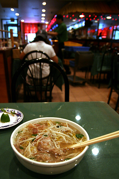 the people who worked there didn't seem to be vietnamese because i heard them speaking cantonese chinese instead. a large asian man wearing a track suit was walking around the restaurant. i've seen enough sopranos to know that's the uniform of organized crime. at one corner of the restaurant was a door with a crane-design bead curtain in front of it. i noticed people going in and out of this secret room, and think there was even a numbered entry pad. could this restaurant actually be a front for a criminal organization? as for the food, it was okay, your basic pho. one of the waiters seemed to be refilling all the tabled sauce containers and i had a forearm rudely reach across my face a few times without asking. after i paid i hit the bathroom one last time before i left. who knows when i'll be able to find another bathroom.