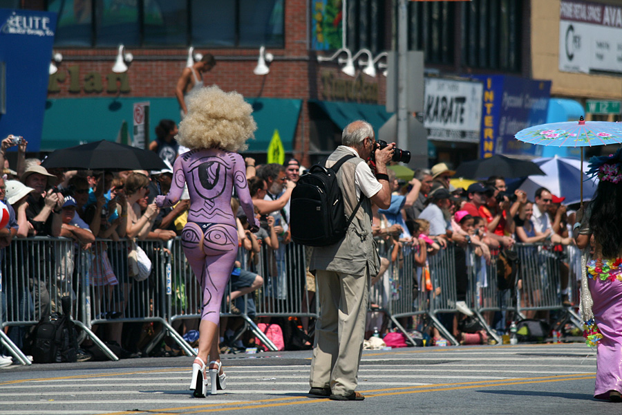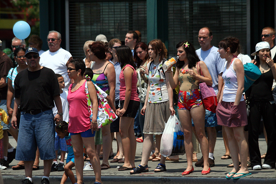 i came back out onto the street and was determined to find a good spot for shooting photos. i ended up right across the street from the coney island terminal, figuring i could capture people as they left the station, sort of a pre-parade warmup. even though the official start of the parade was still an hour and a half away,
