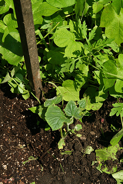 i also transplanted the cucumbers and one chinese melon. i only had enough tomato cages for one cucumber, while the other plants just got wooden stakes.