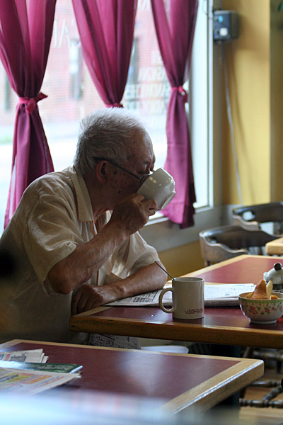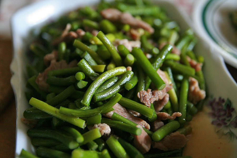 back at the cafe, i helped my parents unload the supplies before riding back to belmont with them for dinner. my mother made a dish with garlic scapes which she bought from whole foods ($8/lbs). she told us some story how this used to be her favorite food growing up but it's too expensive a delicacy for her to have often. i just thought it tasted like thin asparagus stalks with a garlicky flavor. afterwards my father and i investigated more gps-imported waypoints on google earth. while playing with hailey, she ripped another hole in my t-shirt. her tiny teeth are just too sharp! later my sister squeezed a rubber toy that emitted a series of high-pitched squeaks while scared the hell out of hailey, making her run back her sleep pen to hide. the rest of the night she seemed out of it, still too freaked out by the squeak toy.