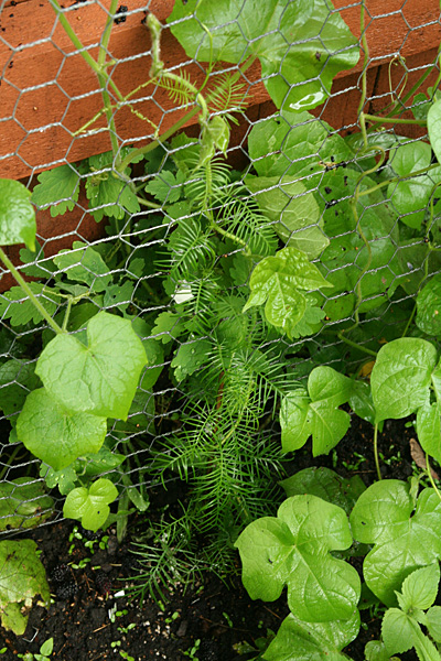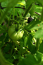 went to the garden to water my plants, my aircast wrapped in a plastic bag. as ridiculous as it looks, if it means less clean up when i get home, i'm doing it. i got a few mosquito bites on my legs, my first of the season. i noticed it yesterday, but there are already immature fruits, both tomatoes and salsa peppers. the feathery leaves of the cypress vines kind of remind me those centipedes that get into the house every once in a while. i brought my pruning clippers today and chopped up a few strangling vines, mostly in the raspberry area. i ended up picking another half container of golden raspberries. coming back home, i bumped into bruce and gave him all my raspberries; there's plenty more where that came from.