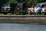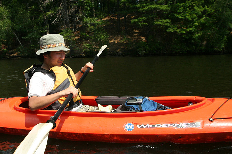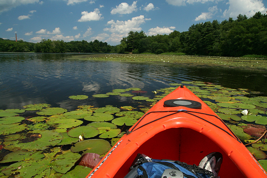 for a weekday, there was a surprisingly large showing of people either kayaking or canoeing. there were a few families but most of them seemed to be camp excursions, canoes full of noisy kids crashing into each other and having impromptu water fights with their paddles. being that my left hand is my dominant hand (even though i write with my right), i found myself continuously drifting to the right when i paddled. at about the 1.5 mile marker we stopped for some lunch, locking our kayaks together in the middle of the river, watching the clouds go by as the current slowly dragged out boat downstream. bruce had some homemade pasta salad with mushrooms and red peppers while i just had a bag of doritos. a check of my gps revealed that we were kayaking at about 2.5 miles per hour, although not factoring in the frequent stops. at our fastest, we could paddle up to 4mph. we went as far as the prospect street bridge (2.5 miles) near waltham center (moody street) before turning back, since the landscape started to look more urban and less scenic.
