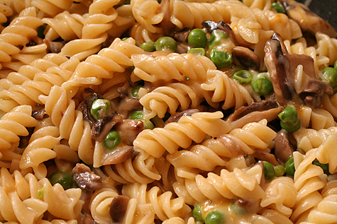 for dinner i whipped up a simple pasta recipe: rotini pasta, button mushrooms, frozen peas, and mexican-cheddar cheese. it looked very similar to the pasta with creamy mushroom-pea sauce that i sometimes make, except no prosciutto and i used shredded cheese instead of cream to thicken the pasta. i also added some olive oil to prevent the pasta from sticking together and a dash of apple vinegar for some additional flavor. what i ended up with seemed like a fancy version of macaroni and cheese. i like the idea of using mushrooms as a meat substitute. not that i'm giving up meat, but i find it more difficult to cook with meat (or maybe, more difficult to get the best flavors out of meat).
