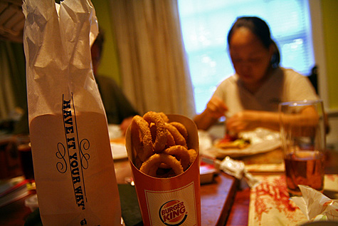 we went to the cafe where we had a very late lunch before i went with my parents back to belmont to take a trip to the waltham costco. for dinner it was that american classic burger king. since i wasn't very hungry, i just ordered the whopper junior (just a dollar!) but did make up for it by eating most of the double jumbo servings of onion rings. by that time my mother noticed most of her rash was gone, and decided it was a good idea to go to the emergency room after all, despite all the waiting.
