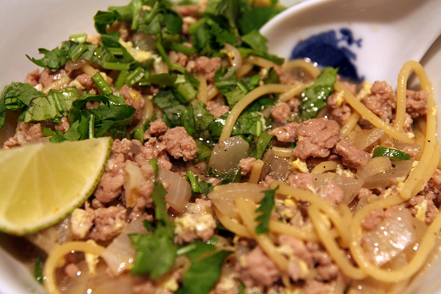 when julie came over today i made filipino pork noodle soup for dinner. what makes it distinctively filipino compared to some other ethnicity i'm not quite sure. it's basically a combination of grounded pork, chicken broth, and thin pasta noodles. nevertheless, the end result was much better than expected,