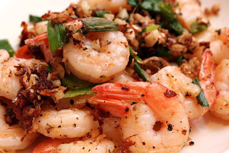 for dinner: made some stir-fried salt & pepper shrimps. the recipe called for raw shrimps but i just had some pre-cooked frozen ones. added to that some leftover lime chili corn from last night. for dessert, some more grass jelly soup along with slices of white peach.