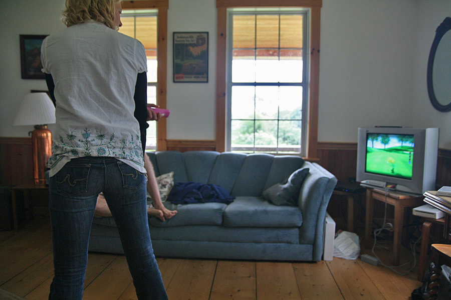 back at the house, people started disappearing, taking naps, resting up for the eventual wedding-reception that would happen later. i ended up playing some wii with kristin and adam. we started with some bowling, which i managed to do pretty well only because i've secretly practiced at home. wii golf however was something new to me. i lost on every hole, becoming quite the expert at the triple bogey.
