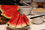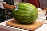 i made some V8 red clam sauce with linguine for dinner. the use of tomato juice was an interesting alternative but seemed like a poor man's recipe. later i had some of the seedless watermelon i bought from star market, a 16lbs. melon for just $2.99. there's some visceral about cutting into a watermelon, exposing all that red flesh inside, dripping with melon juice. i only managed to eat half of a quarter section, putting the rest away in the fridge after some major grocery rearrangement.
