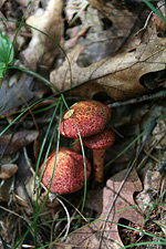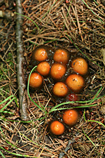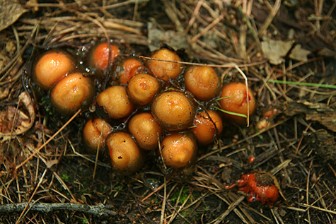with all the recent rain, the forest was covered in mushrooms, which was pretty much the bulk of what we saw. nothing i haven't seen before, and after a while all the ones we saw were pretty much a handful of the same, ranging from the microscopic to the scarily large. the one interesting thing was some possible puffballs in aspic growing along the path by the long vernal pool; they resembled juicy eyeballs or maybe giant tapioca pearls found in boba ice tea.