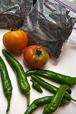 i picked a plastic grocery bag worth of old basil leaves from my garden. hopefully by pruning them back i can get a second crop. the leaves i picked don't look very pretty but hopefully they can cook well. i also picked off some salsa peppers. i was going to leave them on the plants until they turned red but my mother wanted some for cooking. i was surprised how long they were, more like cucumbers than peppers! i also picked a single "giant" thai hot pepper just to try it out. next i went to julie's garden to water her plants. i pruned back her african basil, snipping off most of the flowers off in the hopes of producing more leaves. it's my last day of garden care since julie returns to town tomorrow. i only really needed to water just that one time. besides the basil, i also took two cucumbers from her place, as well as 3 peppers. and i ate a cherry tomato will watering her plants. afterwards i went to market basket to buy a package of frozen strawberries for my smoothies.