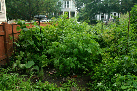 at this stage in the season, i can finally distinguish the difference between the cosmos and the ragweed. both plants look almost identical, but their flowerheads are very different: cosmos have the traditional round buds while the ragweeds form these cylindrical columns of soon-to-be pollen distributors.
