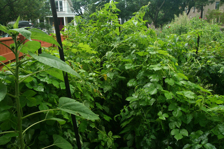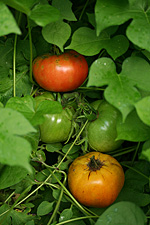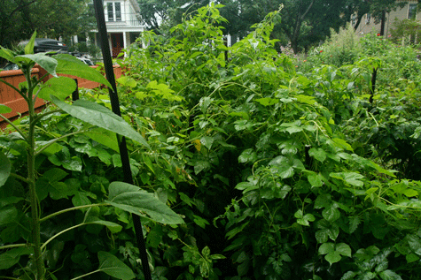 the tomatoes have grown so out of control, it's hard to even know if there are any tomatoes to pick. particularly my two largest tomatoes, which have been swallowed up by a thicket of wild morning glory vines. fortunately ripen tomatoes are more noticeable because they're red; or in the case of the special tomato plant julie gave me, they're an orange-yellow color. i managed to pick one red and one yellow tomato.