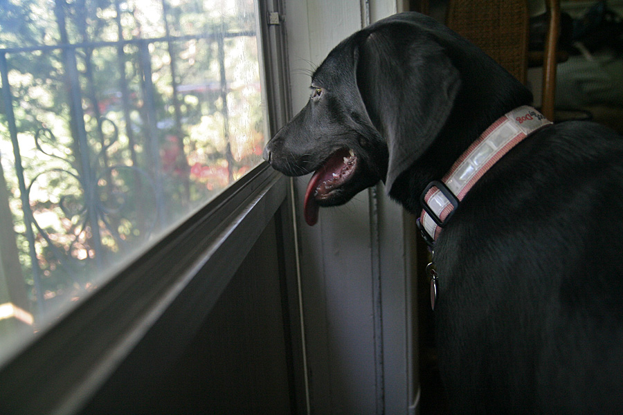i've since learned to only wear old t-shirts when i visit them. my sister continues to find baby dog teeth on the carpet; while i was there she found two more, or at least the ones hailey didn't swallow while her adult teeth are growing in. in the backyard we played fetch; hailey's good at fetching, she just doesn't want to give up the object (be it ball, bucket, or stick) after she brings it back. i also helped my sister give hailey a bath for the first time. short-haired dogs are so much easier to wash. i managed to weigh hailey on the bathroom scale: she's 40 lbs. now.