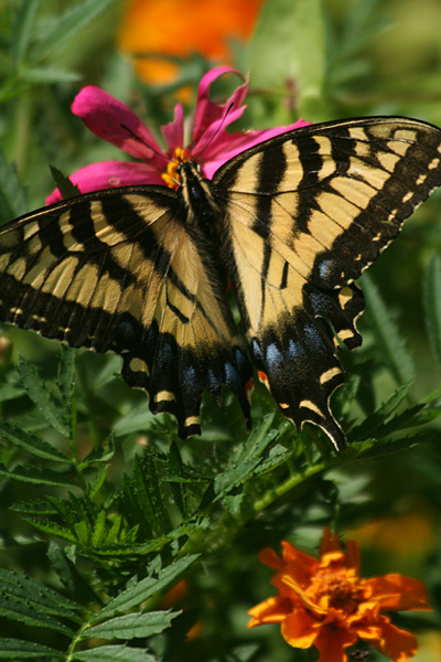 leaving the garden, i noticed a bunch of butterflies visiting the flowers. monarchs are common, but every once in a while i see a tiger swallowtail, like today. less common are american ladies, and i managed to spot a first: a silver-spotted skipper. i shot them with a combination of telephoto and macro lenses (the ones with the black background are probably macro shots).