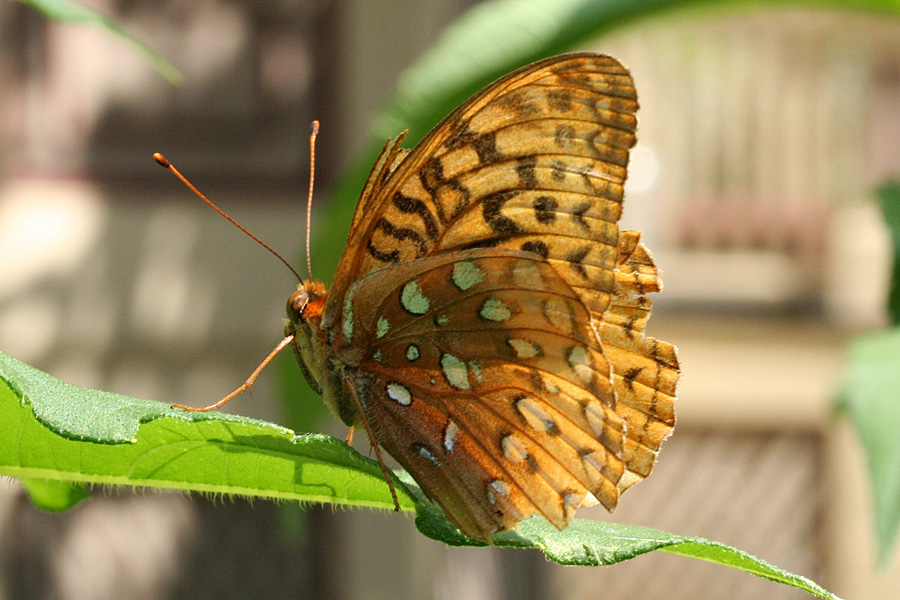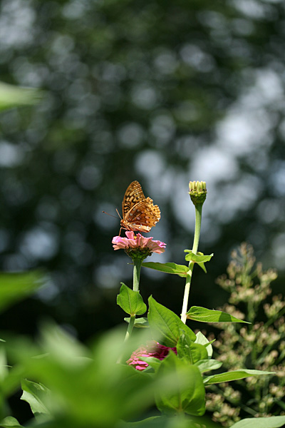 the cypress vine growing at the cafe have white flowers for some reason. my own cypress vines have yet to bloom, not sure what color they're going to be, but they should be red. next year i really want to try growing a patriotic climbing trellis of just red-white-blue flowers. also spotted in the garden today: a great spangled fritillary. i've seen these a few times before (2004 2005) so they're fairly common.