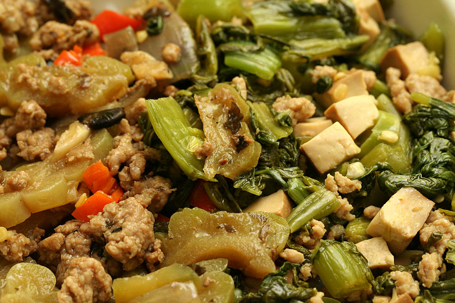 my mother made some extra xuelihong (preserved mustard green) and had my father drop it off for me for lunch on his way to the supermarket.