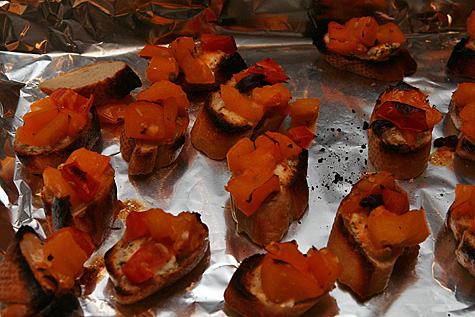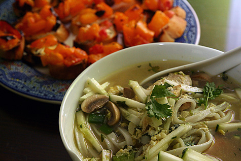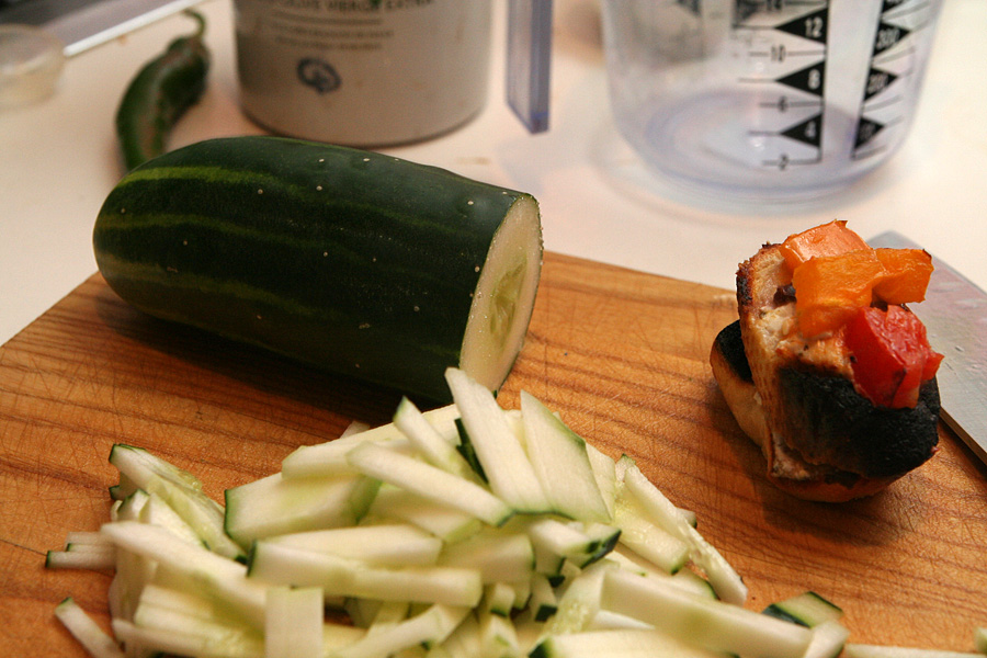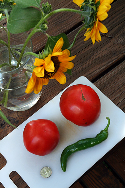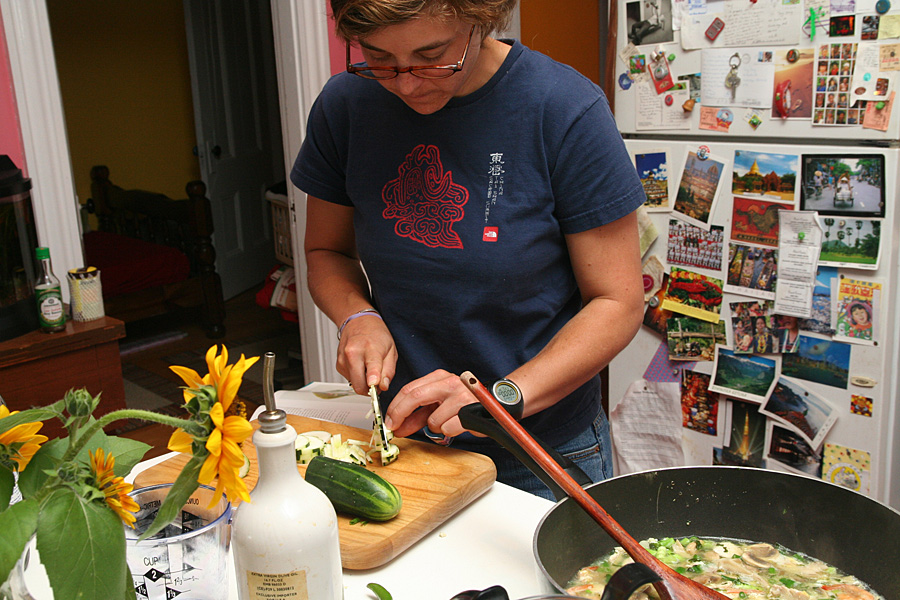 julie came over in the evening. she made bruschetta as an appetizer and this mystery noodle soup involving a dozen different ingredients. i was chopping up some garden vegetables to make some salsa. i ripped the tip of my thumbnail yesterday and some of the hot pepper oil got into the wound. later i accidently rubbed my eye and had to rinse it out with water.