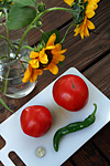 after i finished eating, i went out to run some errands. first stop was the garden, to water my vegetables even after all that rain yesterday. the violence of the storm broke one of my sunflower plants in half. i've yet to see a wild flowering cypress vine but there was a single bud that looked like it might be open for business tomorrow. i picked a large red tomato hidden in the thickets and took the broken sunflower stalk to make some cuttings.