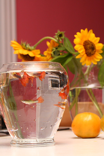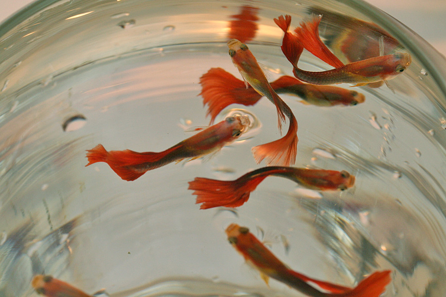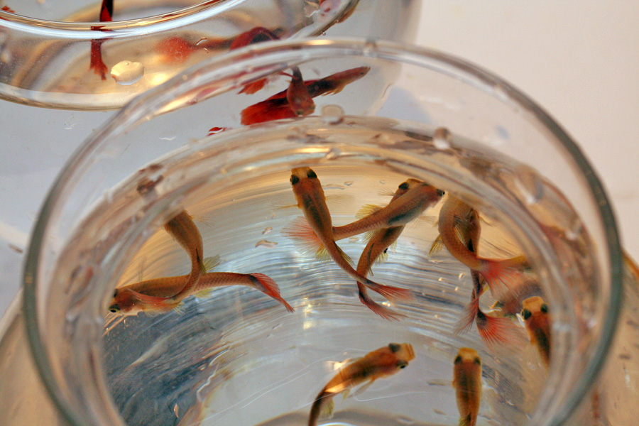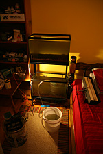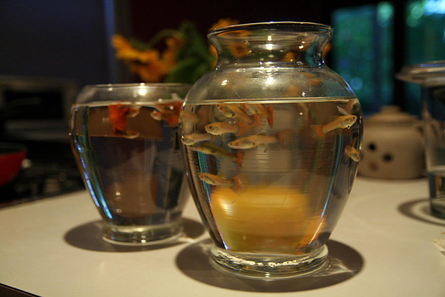 first i scooped out the guppies and put them vases, one for the males, one for the females. i then removed everything from inside the tank: heater, filter, seashells (to make the water harder), and live plants. i scrubbed the algae off of everything with a scouring pad. i then scrubbed the algae from inside the tanks, before starting to drain the water. a 10 gallon aquarium full of water weighs about 100 lbs, too heavy for me to carry (not to mention the sloshing). while siphoning out the bottom tank into a bucket, i went to take some fish photos and forget about the bucket. by the time i heard some strange sounds in the bedroom, two gallons of water had already overflowed all over the floor. it was a real mess and i had to spend some time drying the floor, taking out a soaked rug.