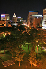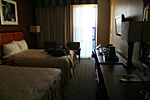 the free internet access at the robert treat hotel (where i'm staying, a best western affiliate) is spotty at best. i spent the last 30 minutes trying to hack into some of the other laptops attached to the wireless router with zero success. the room is small but still big enough to fit two full-sized beds. a wall-mounted flatscreen television further saves on space. the walls are thin though, and i don't dare make too much noise since my traveling partner business associate has the room adjacent to mine. i am on the 8th floor, looking across military park at some nondescript tall buildings and a few old churches. newark looked scary during the daytime, so i probably wasn't going to go out alone at night.