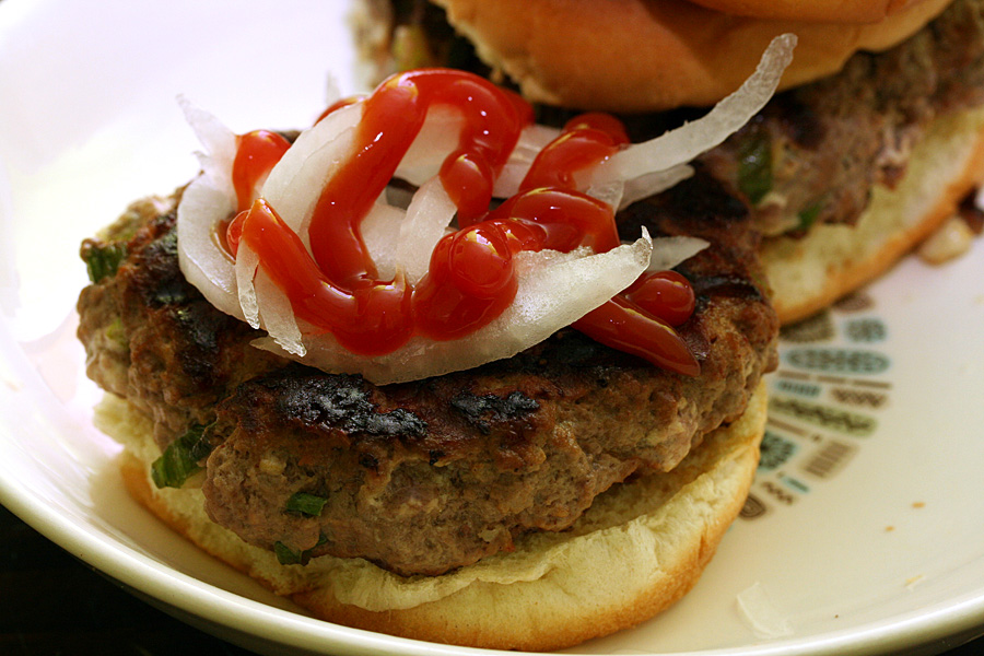 it's probably one of the stinkiest food i know how to make, these thick blue cheese burgers that i prepare on my foreman grill. what goes into it is fairly simple: ground beef, blue cheese crumbles, chopped scallions, chopped garlic, hot sauce, worcestershire sauce, dijon mustard, and some ground pepper. mix all that up, round your patties, and serve with onion slices. the combination is deadly smelly - blue cheese with scallions with garlic with onions. after you eat it you can't talk with anyone for a few days. might as well serve it with a side of kimchee to truly elevate the funk level.
