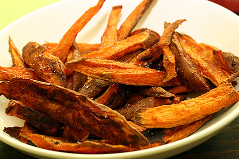 i also made some sweet potato fries, tossed with olive oil, cayenne pepper, cinnamon, and crush sea salt, baked in the oven for over 45 minutes at around 450 degrees. the fries were sliced with skin intact, which gave it a rough outer texture while the inside was a soft sweet potato custard.