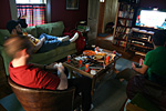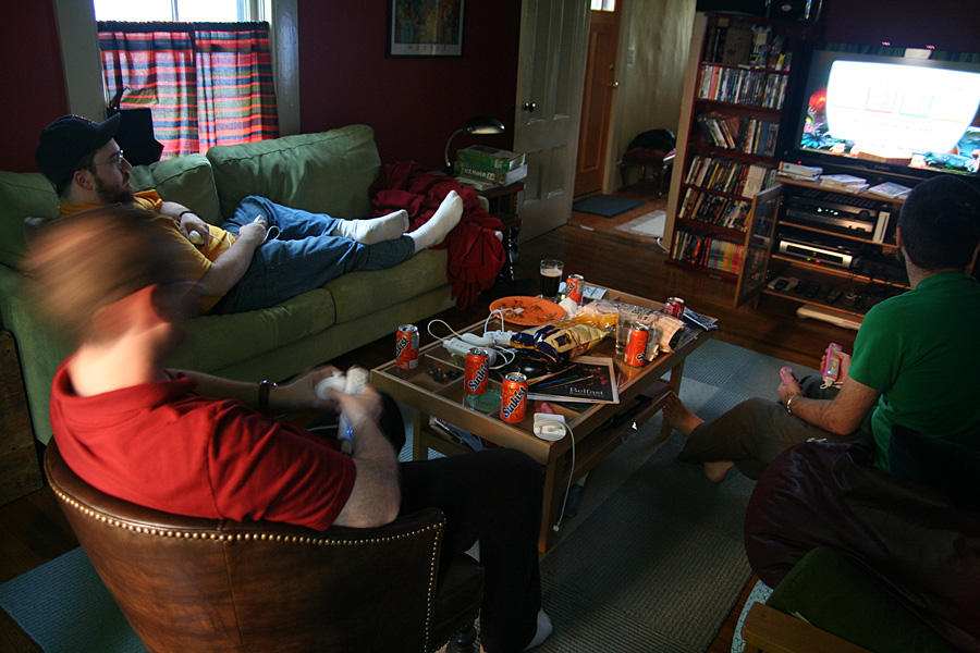 while watching elias and mike fight zombies. amanda was quietly reading the newspaper nearby but later disappeared upstairs, only to leave again in the evening for a lady's night of pumpkin carving. soon after i arrived dan showed up with a bag full of gaming equipment (mainly his wii guitar). we started with some mario kart, followed by super smash bros. brawl (i played my old favorites, like samus and wario, but also got comfortable with lucas). after some force unleashed, we managed to get in a round of boom blox before i had to leave.