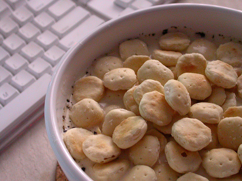 since tomorrow is trash day, i went through the fridge trying to get rid of anything that needed to be thrown away. i ended up having 6-day old clam chowder leftover from last wednesday. after heating it over the stove (authentic heating, none of that microwave heating) i covered it with a layer of oyster crackers. the chowder was awful. how i could've eaten it last week i don't understand. it was all runny and no flavor, like water added to milk. i ate the crackers and tossed the rest of the chowder.