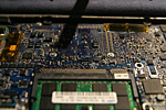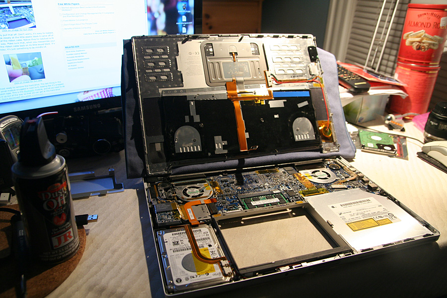 it's probably the closest i'll ever get to actually performing surgery, as i methodically remove the series of screws. i had a hard time getting the case to open but i finally managed to snap it apart with a scary cracking noise. i checked for broken parts but everything looked to be in place. 30 minutes later i had the new drive in place and reassembled the computer. i noticed the front edge of the computer didn't close completely,