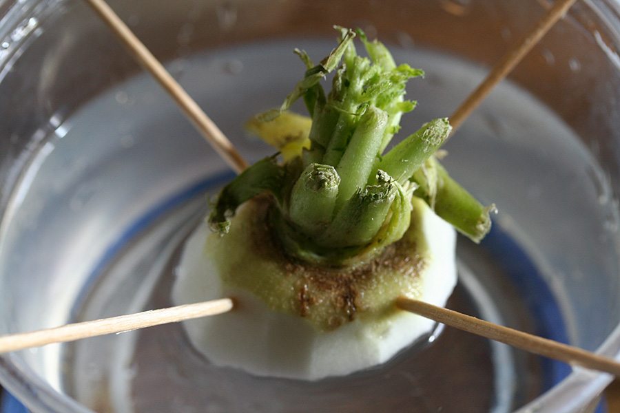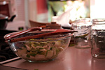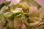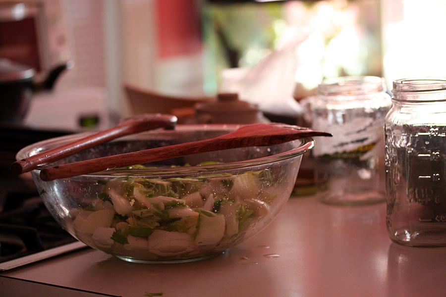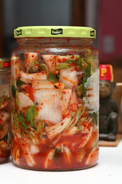 the main component of korean kimchee is napa lettuce, although you may be able to get away with some other cabbage or lettuce variety. i chopped up the lettuce and threw it into a glass bowl. next i did the same to the daikon, cutting them into flat quarter wedges (you may be able to get away with some other carrot or radish). i then sprinkled everything with 2 tbsp of salt, which in hindsight was probably a little bit too much. salt is added for flavoring but it also pulls the water out of the lettuce/radish, reducing everything in size to about 30% of the original. i tossed in some chopped scallions and frozen hot chili peppers just for kicks. after a few hours, i added some chopped garlic (6 cloves) and some ginger slices. also 2 tbsp of the korean crushed hot pepper (the lid actually popped off when i was bringing it home, but fortunately i had it in a bag and managed to get most of the pepper back into the container), mixing everything well before putting them into jars. i managed to fit most of it into a pickle jar (former battery jar), putting the rest away in a smaller salsa jar (i emptied out some leftover salsa). i tasted some of it and it's way too salty, but maybe that's the way it's supposed to taste. now i'm waiting for everything to ferment. my father told me to add some fish bits to the kimchee to speed up fermentation, but i'm afraid of any residual fishy taste so i decided not to add that piece of ingredient.