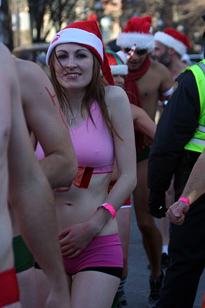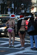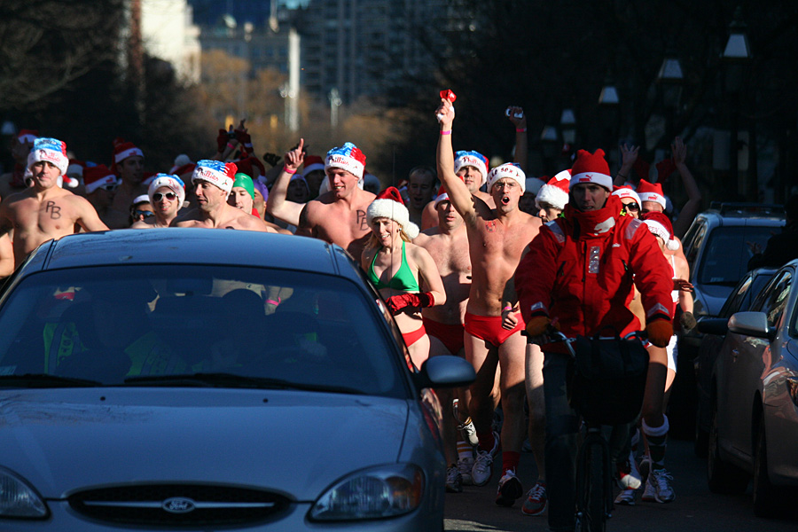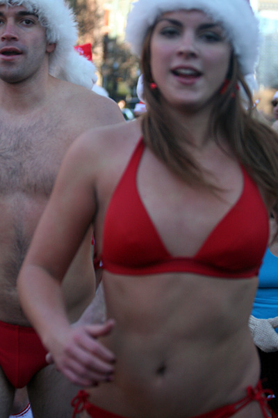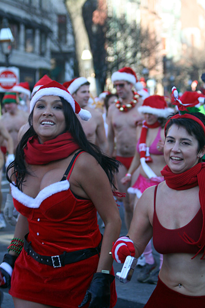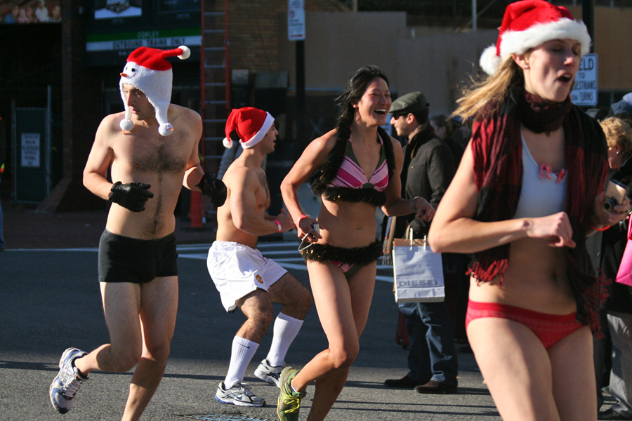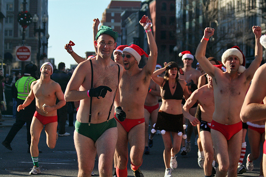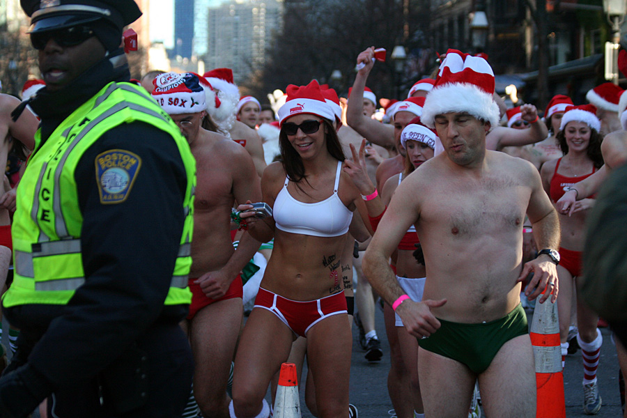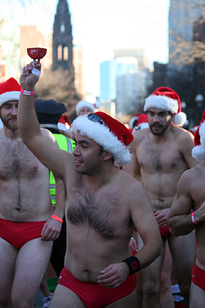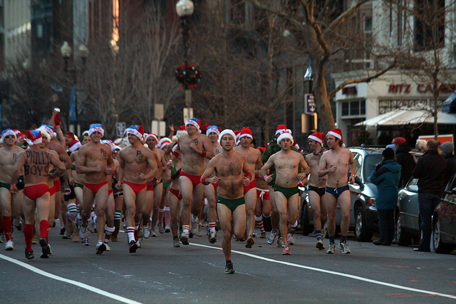 i ended up answering questions from two different tourists as to what was going on. the santa speedo run hasn't been going on long enough that it's developed into a local tradition yet. it's definitely not in any boston tour guides, so it's still a hidden event. what city wouldn't want runners dressed in their santa underwear running around their streets though? not sure if it drums up any sales for the nearby businesses, but it's definitely something fun to see, the last fling of the year.