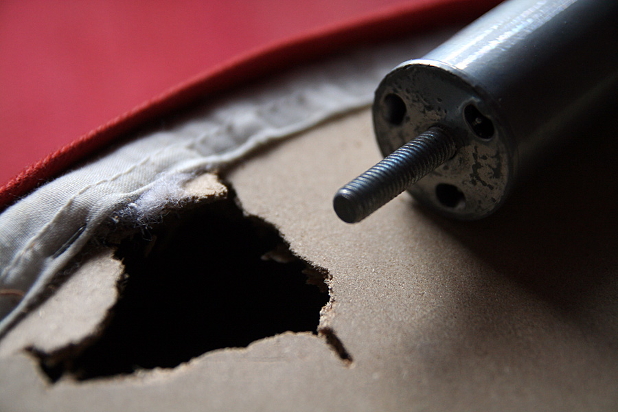 nobody was home yet when i got back. when my roommate returned from his office, he knocked on my door and told me he had a solution to fixing the broken klippan. maybe he felt guilty, although i never directly accused him of anything. all we had to do was drill a new hole at a slight offset and screw the broken leg back on.